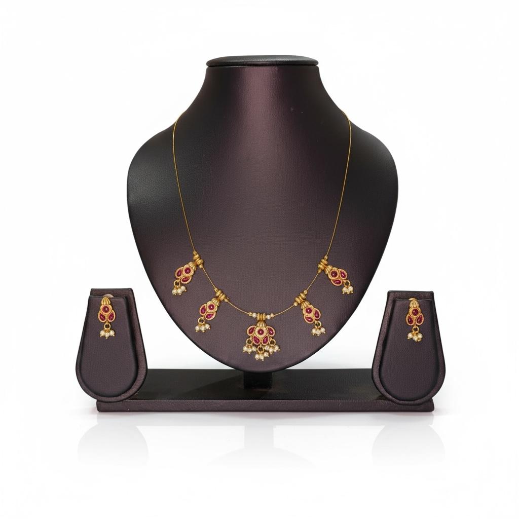 A gold-toned necklace with five pendants adorned with red stones and pearls, accompanied by matching earrings. The jewellery set is displayed on a black mannequin bust and stands on a teal surface.