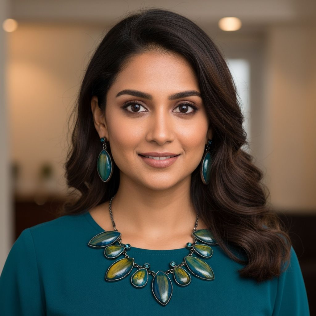 - Necklace: Statement piece with 7 marquise stones and small blue accents
